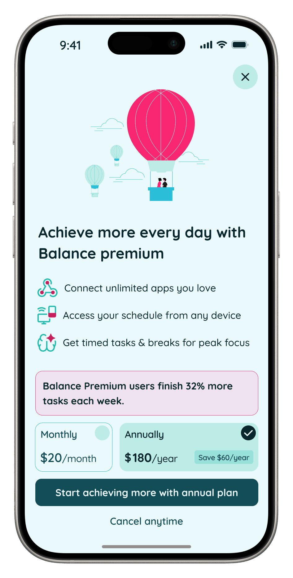 Core features are highlighted like unlimited integrations and cross-device sync to clearly communicate the premium value.