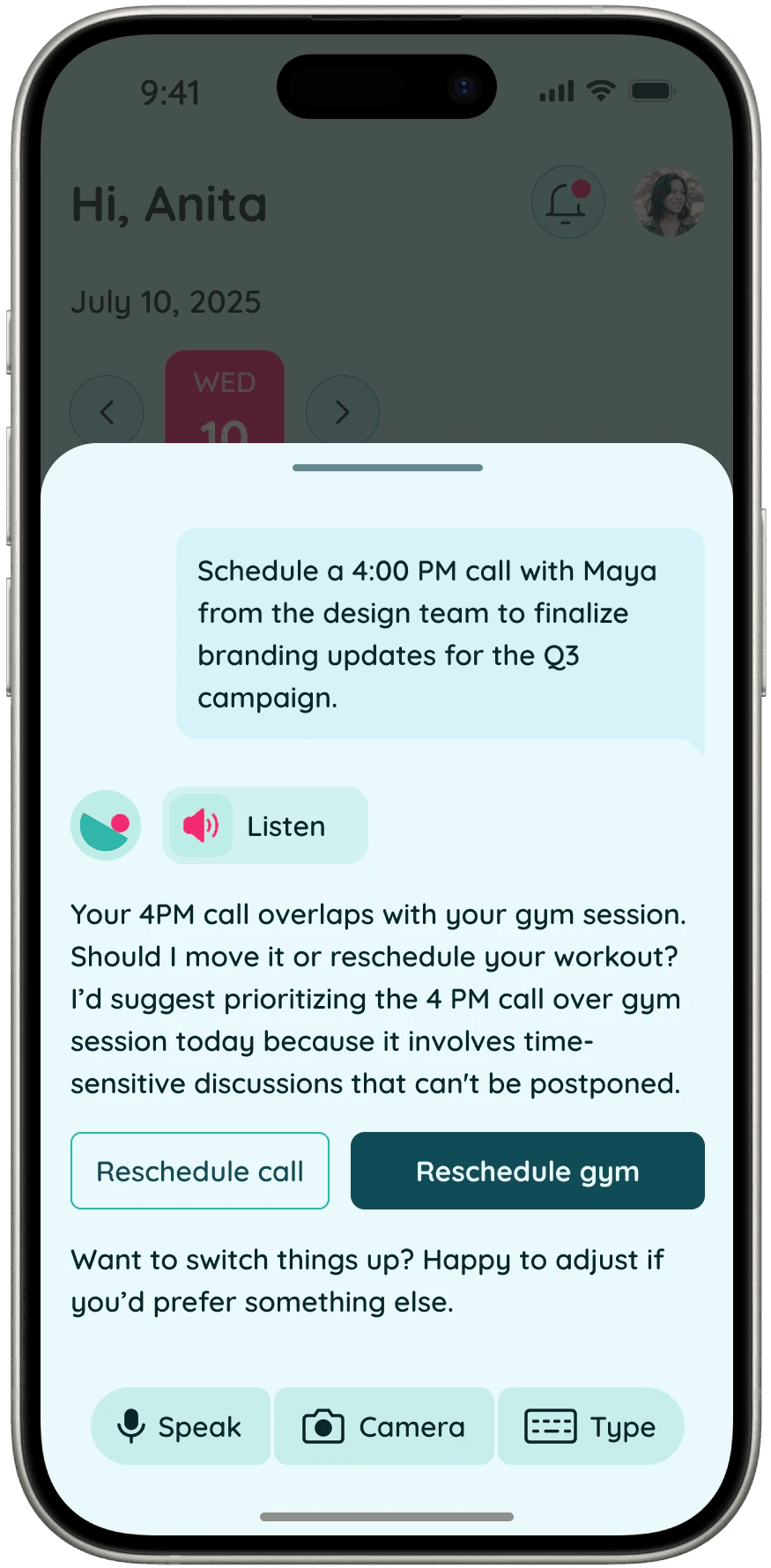 My initial design focused on solving the core problems of disorganization and overwhelm. The solutions I provide are not just reactive, they're proactive and intelligent, acting as a true personal assistant.